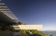The main structure of the house can be described as two beams that emerge from the ground and rest on two pillars. The bedrooms and social areas develop around these beams. On the lower floor, the swimming pool, suspended over two other rooms, advances towards the sea. Inside, there are natural stones that make reference to the local nature.