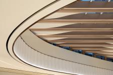 Encompassing two large wings with a centrally located lobby, the design features light, bright finishes alongside curved void edges, accented with modern recessed lighting. The wave-like shapes of the viewing balconies evoke the rolling hills of tea mountains and surrounding nature. The main atrium’s centrepiece is formed by two glass bridges that are illuminated, giving the appearance of a crystal.