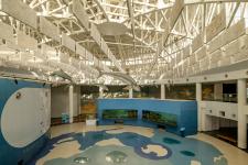 The atrium benefits from diffused natural light, through fritted glass north clerestories. The lower level houses the exhibits, enabling the majority of water loads to remain at ground level within a controlled environment, promoting stable water temperatures & optimal life support systems. The centralized Chilled Water Energy Efficient System with chillers, pumping systems equipped with Variable Frequency Drives (VFDs), & evaporative cooling for fresh air, collectively save 90 tons of cooling by employing domestic water evaporative cooling for fresh air circulation. Integrated Building Management Systems (IBMS) compatibility is maintained through RS-485 equipped meters. Intelligent automation controls lighting, offering dimming, dimout, & programmable options, significantly saving energy.