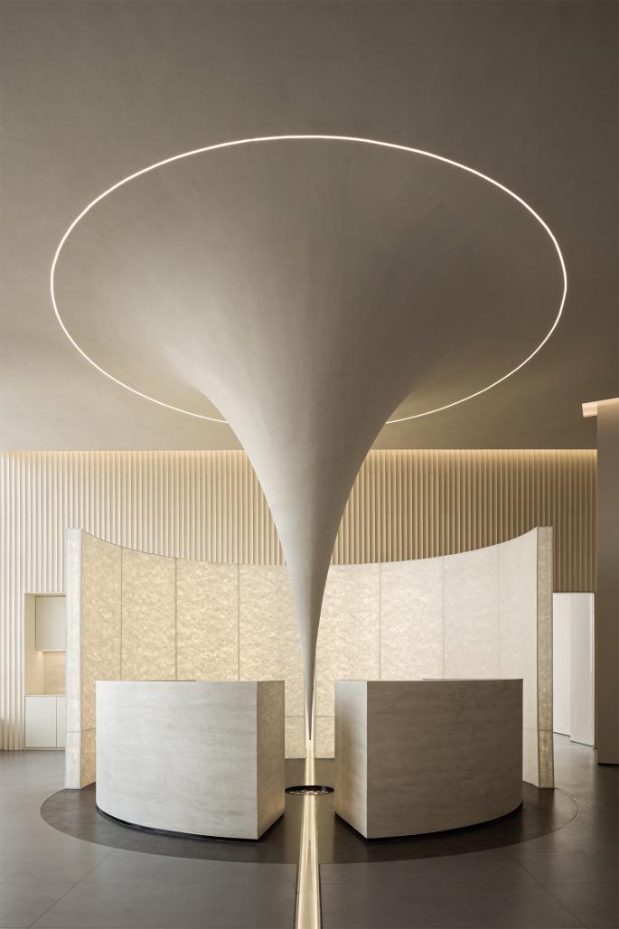 As a natural phenomenon, gravity has the power to alter the state of space and time, guiding objects closer to its source. In the center of the reception hall, the celling appears to be drawn, pulled and stretched by the force of gravity, a metaphor of the brand’s attractiveness through space, then the abstract concepts are manifested in tangible forms. The reception desk, adorned with imitation travertine texture, is placed at a calculated distance on both sides, allowing the gravitational device to be fully displayed before the eyes. Together with the “screen” behind, forming a focal point of spatial energy.