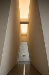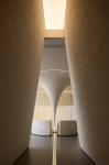 The walls on either sides of the entrance slope and converge from bottom to top, crafting a serene and profound canyon imagery,capitalizing on the spatial height. The summit mimics “a strip of skylight”, creating a gentle texture on facade. After dozens of steps, the vision suddenly become wide open, with the undulating spatial rhythm presented a multi-dimensional site experience. Simultaneously, the light strip embedded in the ground serve as the spatial axis, establishing a symmetrical visual aesthetic and guide visitors along it, commencing a prologue of light.