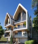 The orientation of the living spaces is strategic. They are deliberately aligned to capture the captivating views of the nearby river and the majestic mountains beyond. This thoughtful positioning ensures that both resident families enjoy unparalleled scenery. The villa’s roof, with its sloping design, not only complements the alpine beauty but also serves as a functional element to withstand the region's winter elements. Meanwhile, the windows are recessed along the western facade, a design choice that provides shelter from the elements.