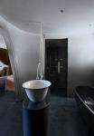 The moody neutral base accentuates the play of tonal shades, surprise bursts of accent colours, sculptural furniture and delicate architectural details. Curved contours, smoothened ceiling corners and organically arched doorways imbue the space with a palpable naturalness amid all the avant-garde design features.