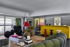 On the right of the bar is the informal TV lounge, furnished with B&B Italia Camaleonda couch, exuding a relaxed vibe with its rounded corners. Vibrant artworks and a sleek Glas Italia mirror adorn the walls.