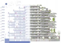 The northern part of the building accommodates the main entrance, wet areas, and "work and live" units, facilitating direct office access while preserving residential privacy. Living areas are positioned on the southern side to optimize sunlight exposure. Unit placement and floor layouts were meticulously planned to ensure uniform area distribution and optimal sunlight, with simulations used to refine facade orientation and light access.