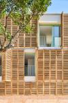 The façade is resolved by a double ceramic sheet with exterior insulation using projected cork and lime coarse developed by local companies, and solar protection made of larch wood (FSC) manufactured by local artisans.