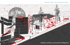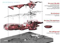The exhibition spaces are designed in two layers, landscapes, and exhibitions reminiscent of fictional nodes. Wayfinding, pathways etc. Sculptural and labyrinthine gardens.