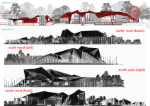 Technical details: The primary structure of the library is conceived as a two-tiered system, characterized by a combination of skin and extruded surfaces, both crafted from fair-faced concrete to form a unified architectural expression. This design employs a frame structure with a column-beam configuration, chosen for its contextual relevance and material availability. The skin of the building features a folded plate structure, with concrete vaults supported by columns, allowing for a dynamic interplay of openness and enclosure. This approach enables the skin to adapt to varying spatial requirements dictated by sun and wind, opening and closing as needed. Reinforced with shear walls in select areas for stability, the overall structural system predominantly relies on columns, integrating functional and aesthetic elements into a cohesive architectural form.