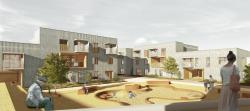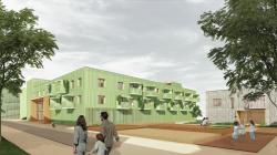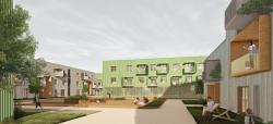 As sustainability goals, the project aims to create a social impact by fostering a sense of community and providing affordable housing, as well as reducing carbon emissions through timber construction, reusable metal claddings, green roofs, and solar panels. Additionally, the project will promote pedestrian mobility throughout the site.