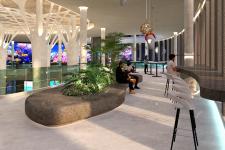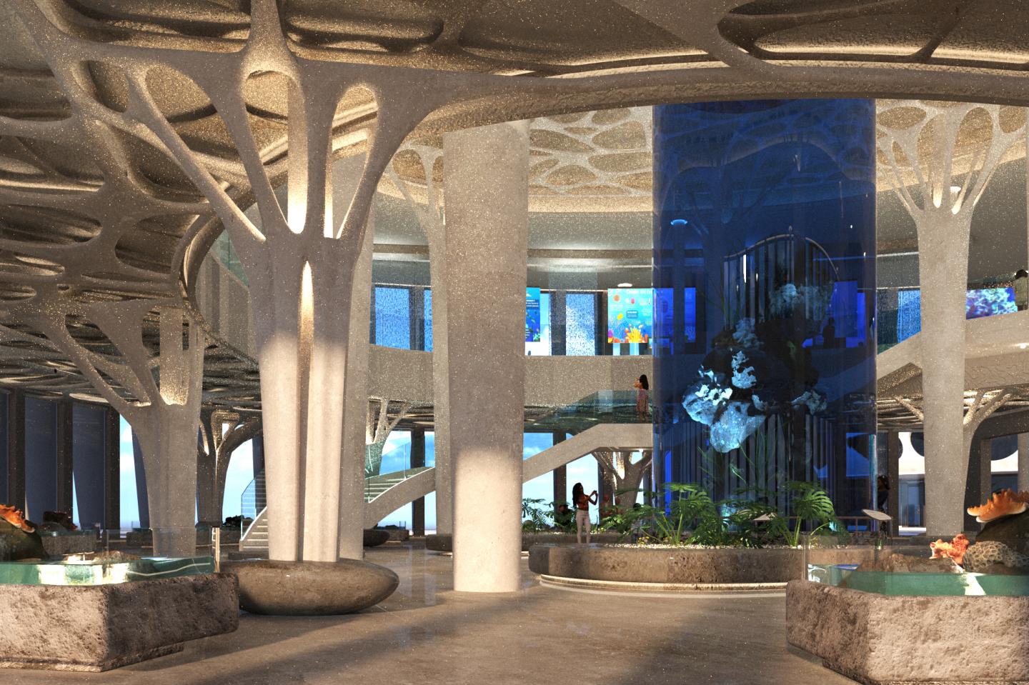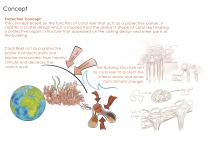 The concept based on the function of coral reef that acts as a protective barrier. It creates a cluster design which is inspired from the abstract shape of coral reef making a protective organic structure that appeared on the ceiling design and other parts of the building.