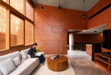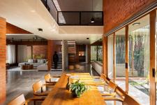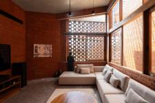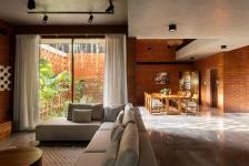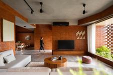 The material and colour palette devised for the interiors is in perfect sync with the architecture. The rustic brick converses beautifully with the warm teak wood (used on the doors, windows, wardrobes, shelves and bespoke furniture pieces), the elegant Italian marble floors, the plush hand-picked rugs and upholstery fabrics, and the raw cement-finished ceilings... and adds to the sensory dynamism of the space. Even the artworks that grace the walls of this modern house were meticulously sourced. The landscaped courtyards with lush greenery further impart colour and freshness into the comfortable and balmy interiors.