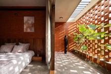 The functional syntax flows to the family room (on the ground floor) and the living rooms (on the ground and first floors) and the bedroom suites (one each) on both these floors. The bedroom suites enjoy their private landscaped courts which are enveloped by brick louvers that usher cool breezes, whilst forming a privacy screen from the surroundings. The spa (on the first floor) is also designed with the internal courtyard alongside, with the bright skylight adding to its comforting and natural charm. A touch of green also wraps the bathing area in the son’s bathroom, which fits a trough filled with plants.