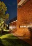 To meet the brief, the studio decided to tread the unconventional route with the architecture of the building by designing an iconic structure. A two-storied structure was conceived highlighting the juxtaposition of two simple platonic forms - where an angled triangular portion appears to be added adjacent to a skewed rectangular form. This unusual futuristic building was given a traditional twist by realising it entirely in a versatile material, burnt bricks. The exposed bricks were laid painstakingly on top of each with lattice-like perforations at intervals to ventilate and light up the interiors, and to create a beautiful play of light and shadow within. The slanting roof emphasises the climate-friendly architecture further, as it reduces heat and drains water swiftly during the heavy monsoon months.