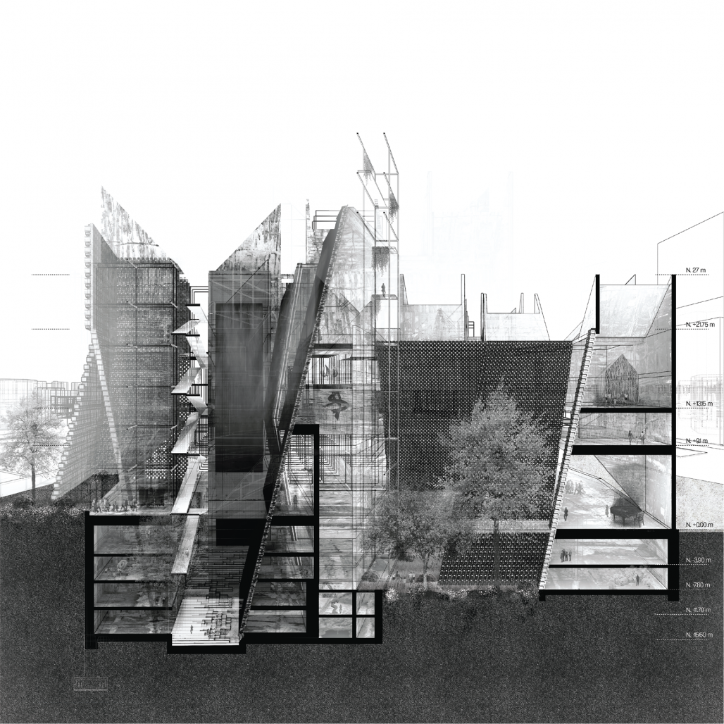 The abandoned structure of the National Museum of Memory has a Mat building typology, a unique module is repeated or removed depending on necessity and expanded throughout. The project proposal uses ‘void’ in a planned repetition considering the pattern of the Mat building to design a clear ground floor and vertical connection, inviting the user to explore both. The strategy of ‘void’ is applied in two ways: carved void or added void.