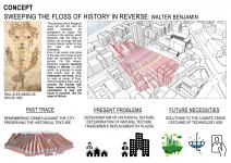 The Salvation Platform project is a project that tries to exist physically, socially and tectonically with the concerns of past-present-future, starting from the main theme of Crime Against the City (CAC). The concept of this project is based on Walter Benjamin's words of ''Sweeping the Floss of History in Reverse''. Thus, the connection of this project with the main theme of Crime Against City, mass decisions, program and scenario can be understood. Walter Benjamin's words come from here. The painting 'Angelus Novus', which Benjamin never leaved with until his death, reflects his perspective on history. Benjamin calls the creature in this painting by Paul Klee the angel of history. While the wings and feet of this angel of history move forward, his face and eyes are fixed on a point looking back. Benjamin interprets this as follows. The sad events that happened in the past are where the being's eyes are fixed. However, since time also flows, the feet and wings of the angel of history move in the opposite direction. In other words, even if sad events happened in the past, time moves and there are necessities of the present and the future. For this reason, Benjamin suggests scanning history in reverse. Floss is the fluff in woolen items such as carpets and sweaters. For example, if we comb our hair backwards, something gets attached, those things that get stuck are the traces of the past. In short, without forgetting past events but not remaining constant there, it is possible to respond to present and future requirements by sweeping the floss of history backwards.