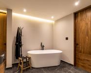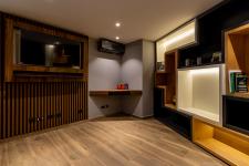 For the general finishes, a mix of woods was chosen to achieve a very warm atmosphere that was contrasted with black marble-type ceramics. A combination of neutral colored paint and textured wallpaper was used for the walls to add depth and style to the room.