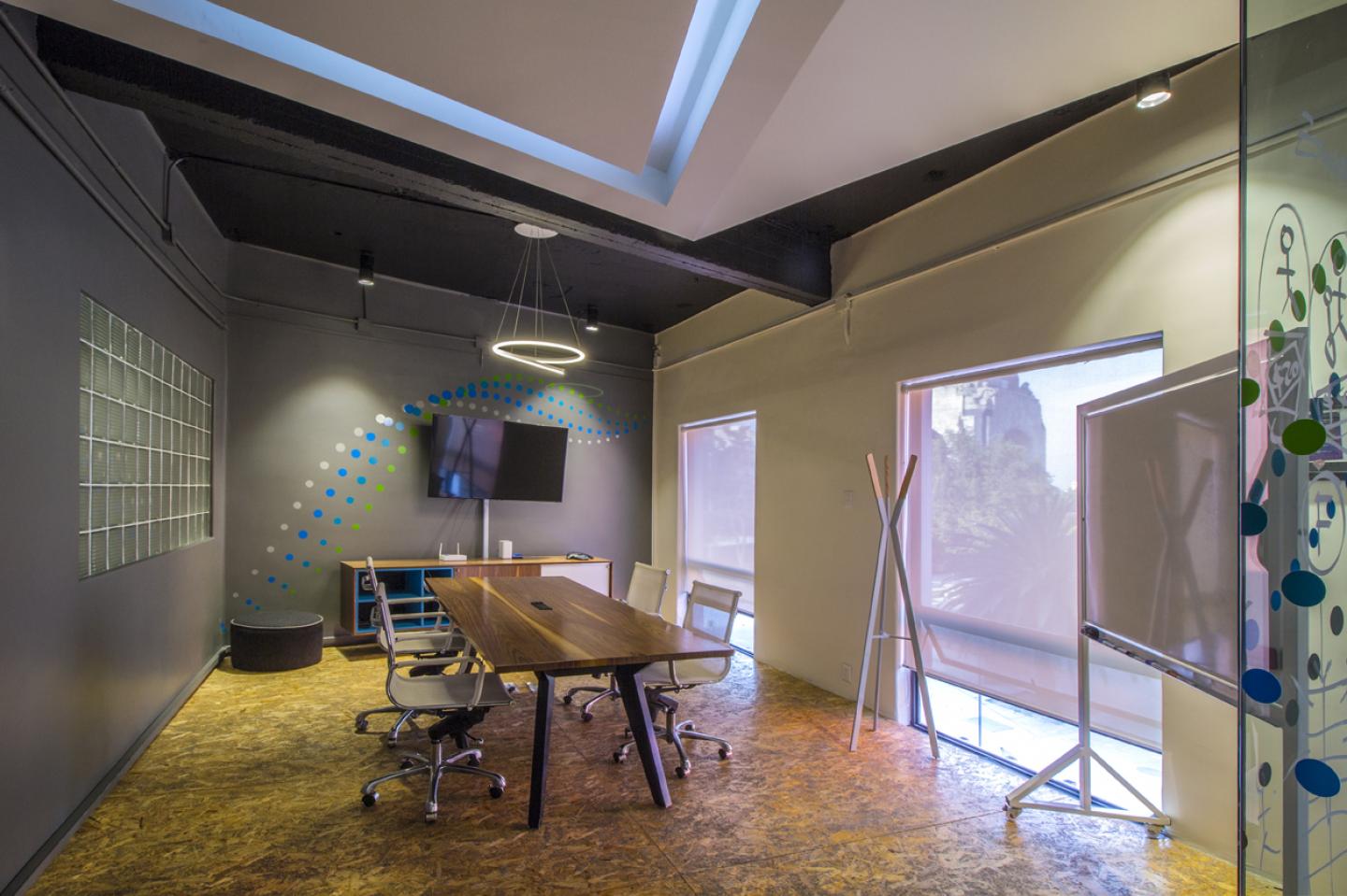 La oficina principal y la sala de juntas están divididas con cristal, lo que las integra visualmente con el resto de la oficina, además estos cristales pueden ser usados como pizarrones. El piso de tablero OSB ayuda a amortiguar la acústica y dar calidez al espacio.