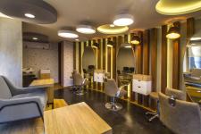 Un ambiente sofisticado era el objetivo solicitado por el cliente para el diseño interior de su salón Silvette. El elemento principal del espacio es una celosía de madera que marca la distribución de las áreas y para enfatizar su protagonismo el equipo de DIN interiorismo decidió iluminarla de forma indirecta para hacerla sobresalir. La celosía sirve además como soporte para las unidades de atención a clientes recibiendo los espejos y cajoneras de cada lugar.