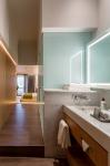 Each column has a wood veneer finish, which helps the continuity of the design and harmony in the finish scheme. This entire set of rooms shares a gym that is located at the center of the project with a curved smoke-colored glass and its bathrooms with marble finish and oval mirrors with indirect light. They also share a lounge area that is located next to the gym, with armchairs and tables in neutral colors.