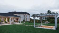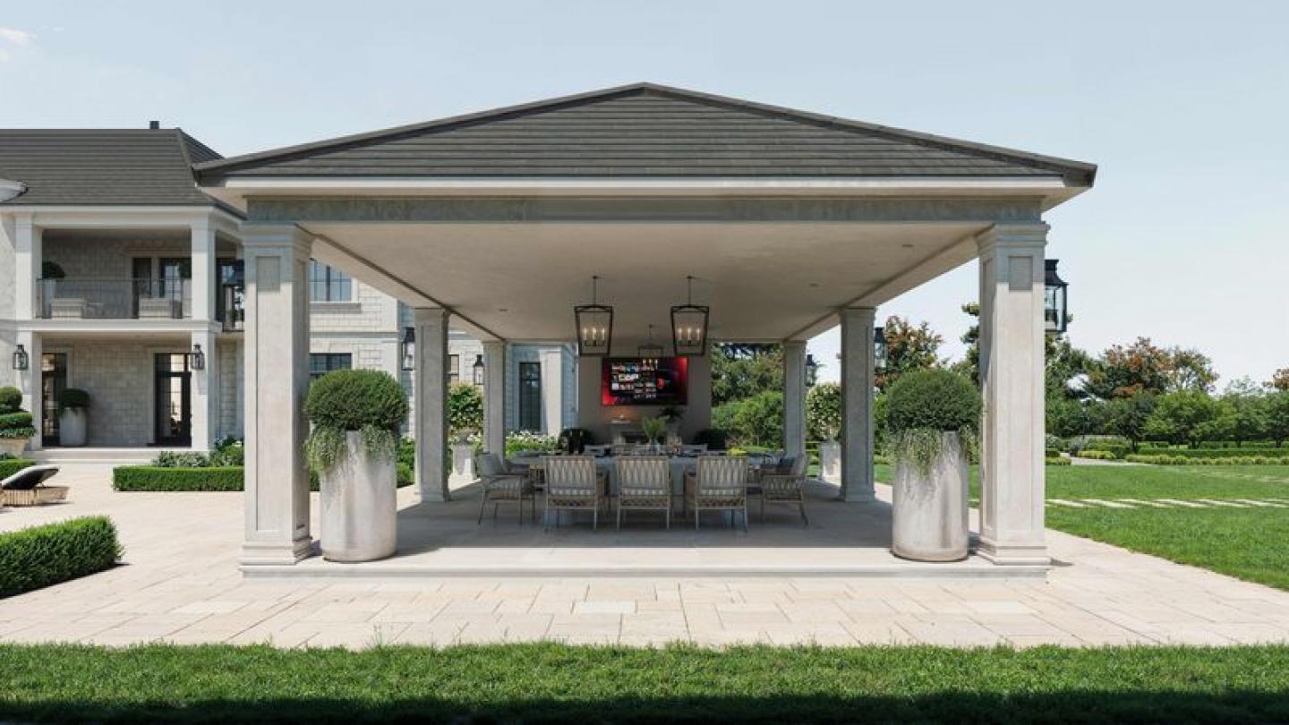 A sunken outdoor kitchen, nestled beneath a floating pergola, beckons you to embark on an al fresco culinary journey amidst the lush surroundings. Imagine the warmth emanating from a strategically placed fire pit, creating an inviting ambiance. As you explore further, a spacious pergola with a dining area and an entertainment TV transforms outdoor living into a lavish experience tailored just for you.