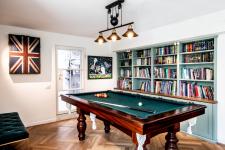 "The basement of the house is unique, designed, and very experiential, and it has an atmosphere of sports, pub, leisure life, and entertainment. We incorporated a snooker table, a dart board, a record player with a record stand, guitars, a designed library, etc. Opposite this space stands a dry sauna room that strengthens the sense of fun and vacation that prevails in the residence."