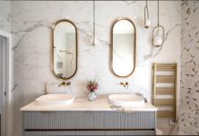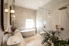 "The couple's bedroom faces the yard and pool. The attached bathroom is designed in a royal style with emphasis on every detail. The tiles we used to cover the walls combine gold, white, and gray tones - a reference to the house's color palette. The free-standing bathtub strengthens the classic atmosphere and enhances the designed and prestigious experience prevailing in the entire suite."