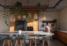 The dining area is especially large and can seat ten diners, made of iron legs and a cork board top. The kitchen is located on the left side of the patio, its shape is L-shaped, and in its center is a large island used for daily family meals and cooking. The kitchen fronts are made of oak wood, as are the island fronts, which are covered on the side facing the patio with tiles painted in botanical patterns. For the surfaces, we chose natural sand-colored marble, and above the center of the space floats a rusty iron construction created by the homeowner, on which natural vegetation grows, and in its center are five straw shades of different sizes.
