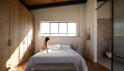 The family's bedrooms enjoy a perfect view of the landscape and sit under the sloping ceiling, made of steel beams and wood cladding, which starts at a height of 2.8 meters and reaches a peak of 3.8 meters. The walls of the children's rooms were covered with mineral plaster and designed according to their age and taste. The master bedroom is conceptually divided into a bedroom with a wall-to-wall oak wardrobe and a bathroom, between which a steel partition combined with master-line glass separates. It is mostly open (except for the wet area) and crosses the large window overlooking the view of the grove and the Galilee mountains. The toilet area is hidden behind a built wall, and the space is covered with porcelain granite tiles: the floor in light gray and the walls with brick tiles in terracotta color.
