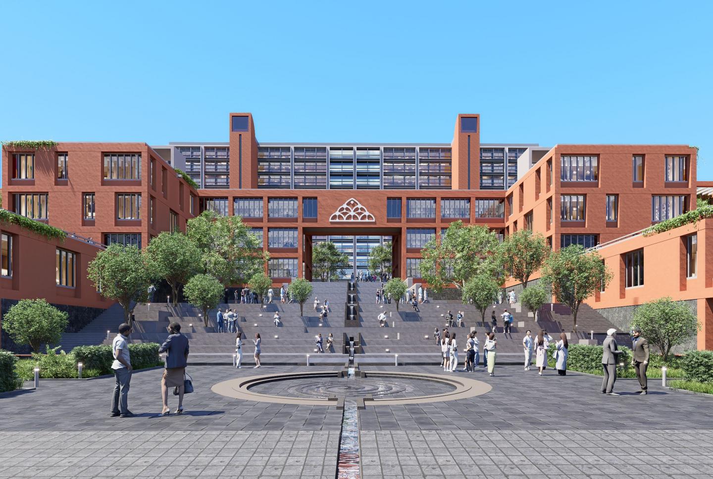 At the core of the design is the Academic Quadrangle, characterized by a modular, stepped structure that maximizes space efficiency. This design creates multiple terraces at varying levels, serving not just as aesthetic elements but as interactive spaces that encourage collaboration and community building. The seamless integration of hardscapes with softscapes enhances the connection between the built environment and nature, fostering an inspiring atmosphere for learning and growth.