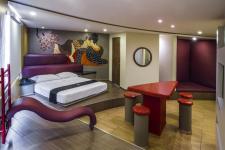 An essential part of the Love Hotels are the foreplaydomes (original concept of DIN interiorismo), these elements that arouse in the guests the desire for adventure and experimentation, for this hotel three main types were designed. One on the headboard shaped as stands, the second one is a seat suspended by steel cables reminding Geta shoes and the third one shaped as a tong with adjustable heights.