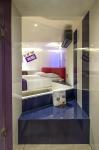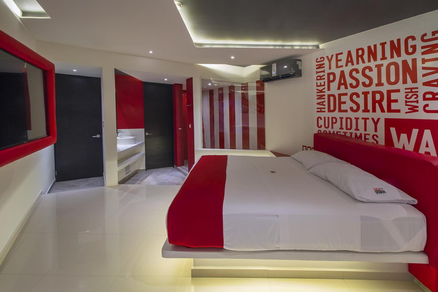 The design of the rooms was supported with graphics inspired in the work of artist Barbara Kruger, that were balanced with white walls to reach the correct percentages of elements, graphics and color, in harmony with the main elements of the room. The bed was placed at 30° defining the starting point for the distribution of the space. Behind the headboard an angled Foreplaydome was designed and the shower is surrounded by glass framing the view towards the room.