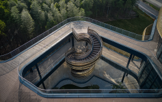 In the courtyard enclosed by the building volume and a series of elevated walkways, the architect has carefully placed a spiral staircase: it allows visitors to ascend to the second-floor viewing platform from ground level, but also provides a strong visual focus for the courtyard space overall. Its concentric circular steps with changing radii and variegated side railing create a dynamic, complex shape which provides a creative tension with the other elements of the space.