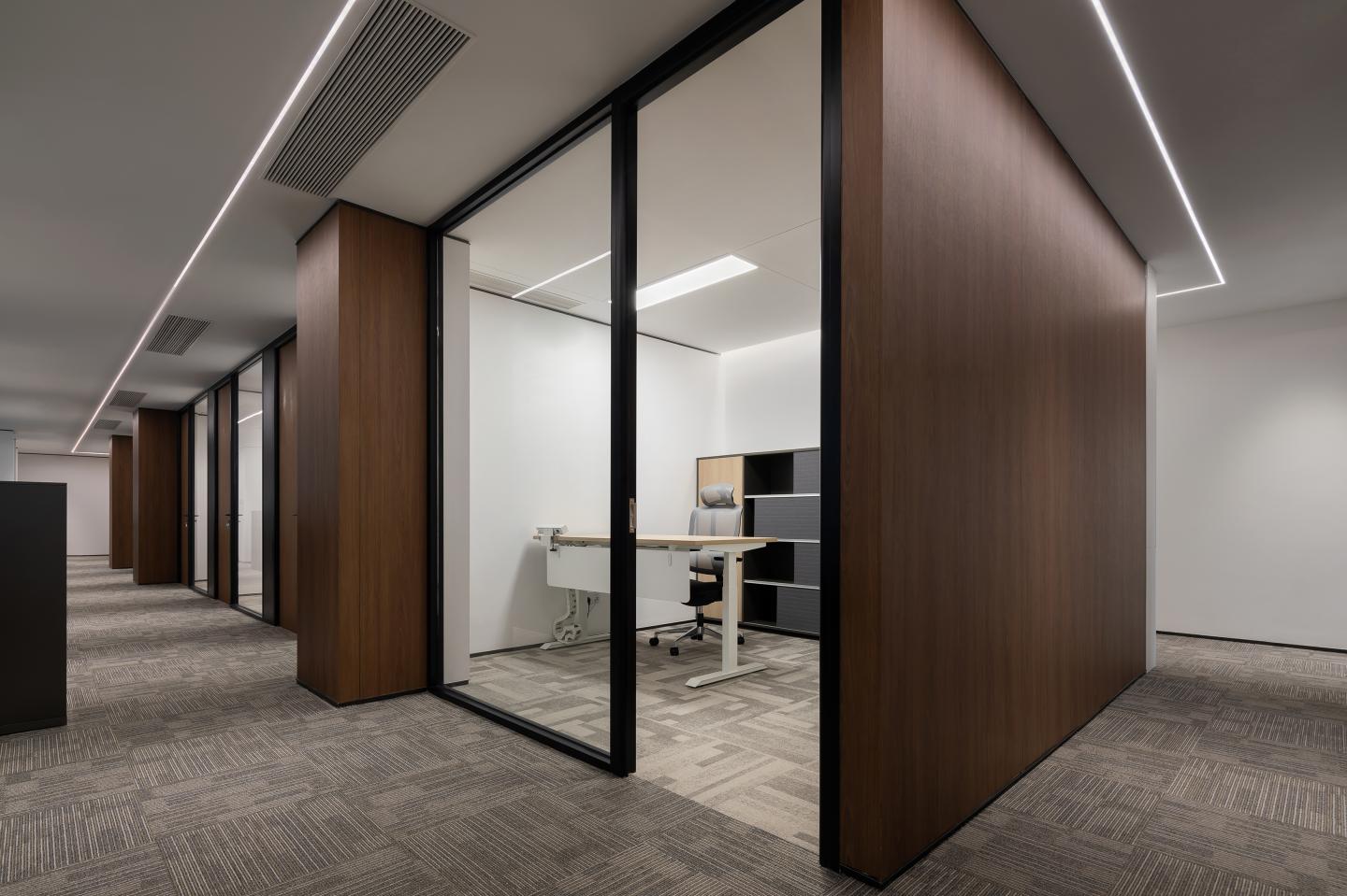 The open office area, anchored by dark gray furniture, conveys seriousness and stability, while two shades of wood introduce a natural warmth, creating a workspace that embodies both humanistic and professional qualities.