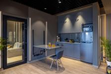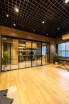 A testament to adaptability, a bifold sliding aluminium door separates the meeting room, offering privacy and an open stage for impromptu performances. Sheer curtains delicately divide zones, infusing an intimate warmth into the space. Wooden blinds in the pantry area not only conceal seamlessly but absorb any stray noise, preserving the sanctity of the studio.