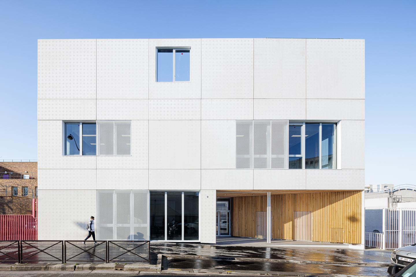 The building stands out as a simple yet sophisticated “Parisian white” mineral volume. In the dense and diverse urban context the cubic form and the facade’s simple and timeless appearance provides a serene presence. The architectural design relies on a delicate balance between transparency and opacity, mineral consistency and porosity. The envelope is clad in white concrete, composed of large panels sandblasted with a circular pattern that reveals the underlying texture. The facade is punctuated by large openings that have been strategically placed to maximise natural light inside the building and frame views towards the context, triggering curiosity by simultaneously concealing and revealing the activities within. The intimacy of the inner spaces is calibrated through the variable transparency of the envelope. In front of the large windows, perforated metal panels echo the circular aesthetics of the facade, providing sun protection while allowing for natural ventilation since the windows behind them can be opened safely.