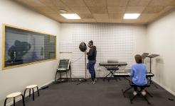 The spacious interiors feature generous ceiling heights and provide multiple activity spaces. A compact circulation system organised around a large sculptural staircase distributes functions across the building's four floors: the lower floor houses the music studio; the ground floor features the entrance lobby, youth activity room, kitchen and event space, reception area, and staff offices; while the first floor is dedicated to art and digital workshops and the dance studio.