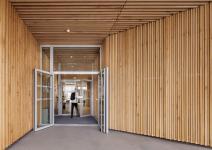 The entrance features wooden cladding with a vertical pattern of solid oak slats, creating a warm atmosphere that extends into the building. The acoustic wall panels, consisting of vertical wooden grooves, and the wood wool ceilings harmonise with the raw concrete walls.
