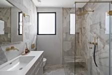 "Although the work focused almost entirely on the ground floor, we suggested to the couple to make a planning change in the bedroom that actually creates a fundamental change in the energies and flow in the space," says Muskal. "Before the renovation, the bed faced the wardrobe door, in a position that damaged the feeling and experience. For this purpose, we redesigned the wardrobe room and the furniture arrangement in the bedroom, so now the space is much more harmonious and complete. Just like on the ground floor, in the parts we handled on this floor, the details are evident in the carpentry items and the use of stylized elements such as handles and mirror frames - every detail is very characterized and carefully chosen. The same applies to the bathrooms, which might appear not entirely conventional for some Israelis, largely due to particularly dominant porcelain granite tiles resembling marble, with patterns that create movement on their surface."