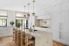 "The clients are traditionally observant, and the lady of the house is super practical, meticulous about cleanliness and maintenance, and really loves to cook - food and hosting are very significant for the family members, and the kitchen became the heart of the project. The kitchen location remained the same, but we planned a different layout: we significantly enlarged it at the expense of the original dining area, which was enormous in size, and planned more effective divisions such as a significant pantry accessed through the tall cabinet wall. On this occasion, we also changed the structure of the adjacent guest bathroom and made it much more spacious."