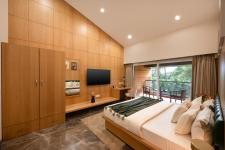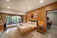 The first floor has a sloping roof. The earlier defined guest house has maintained a flat false ceiling not respecting the structure. We decided to keep the profile of the sloping roof thereby giving a grandness for the VIP suits