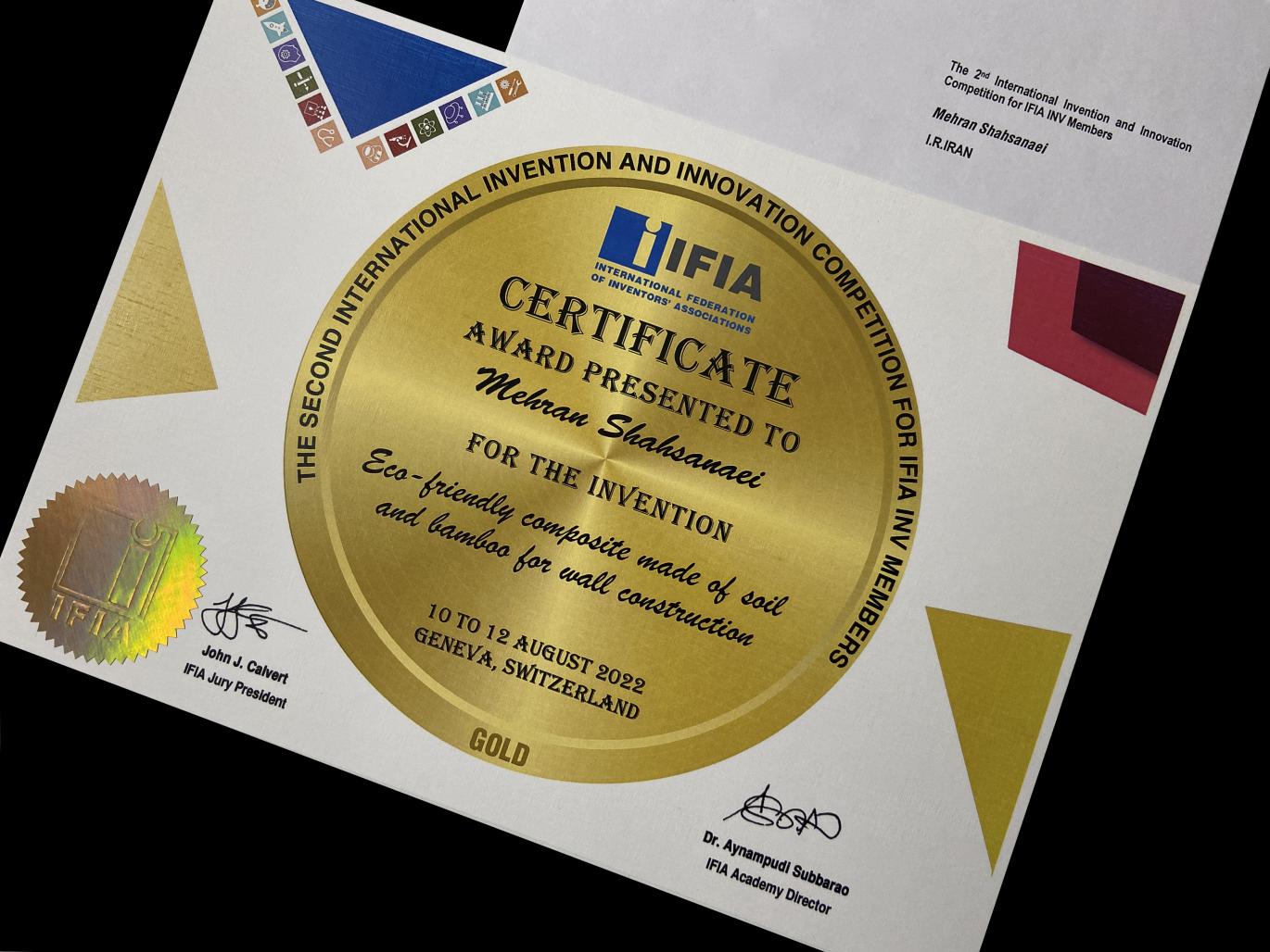 Among these 830 submissions, Shah Sanaei's proposal titled "Eco-friendly composite material for constructing load-bearing walls that are resistant to lateral forces" was honored with the gold medal in Class C (Architecture, Civil Engineering, Building, Construction, and Materials).