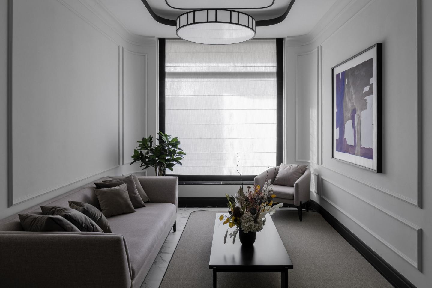 Nordic minimalism influences the interior design, evident in the stainless steel fixtures — from lighting to door handles, grids, and wayfinding elements — which complement the French balcony railings and facade windows. A welcoming resident lounge, complete with comfortable seating and a coffee table, serves as a convenient space for meeting delivery personnel or waiting for transportation. The ambiance is enhanced by carefully curated plants, artwork, and sculptures that blend home comfort with modern design.