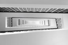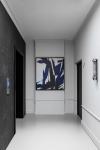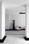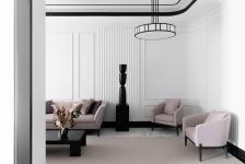 The sophisticated design extends beyond the exterior, flowing seamlessly into the entrance halls and underground parking facilities. The entrance halls showcase light beige walls and ceilings, enhanced by thoughtfully placed contrasting elements including stained glass frames, drawers, dividers, ceiling details, and decorative pieces. Geometric patterns are reinforced through wall mouldings and 3D panels, while the flooring combines white porcelain tiles with black borders and classic-patterned dirt-trapper carpets.