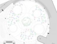 In the Primary/Secondary cafeteria, a central tree serves as a focal point, highlighted by a circular pattern on both the floor and ceiling. The color palette, subtly echoing the school’s colors, is intertwined with natural elements like vegetation and concrete, creating a cozy atmosphere that connects with the surrounding nature of the campus. The ceiling, adorned with diagonal panels and circular lights, enhances the circular geometry of the building.