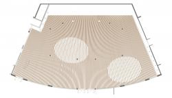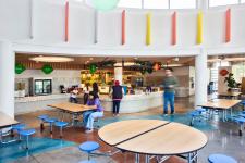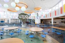 In the Secondary cafeteria, a U-shaped service area was implemented to significantly reduce waiting times, doubling capacity by optimizing space. The "concrete garden," featuring changing colors and lush vegetation, adds a fresh and dynamic vibe to the environment. The ceiling incorporates panels of varying lengths, arranged in a pattern that adapts to the existing trapezoidal geometry. In key areas, such as the senior students’ lounge and the concrete garden, the panels gradually disappear, forming circular spaces that allow light to filter through, creating a “floating cloud” effect.