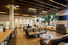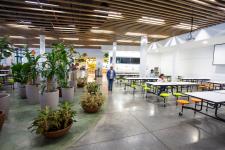 The interior design of the cafeteria draws inspiration from the campus’s architectural style, resulting in a refined blend of indoor and outdoor spaces. This concept blurs the boundaries between these environments, facilitating a transition that enhances the user experience through a careful selection of materials.