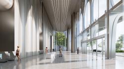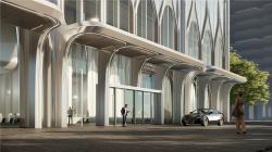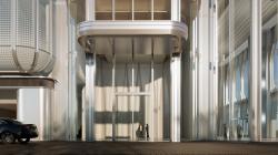 The canopy at the entrance of the office and corporate studio continues the smooth lines of the tower's façade. It incorporates decorative symbols of Lingnan architecture and elements of Art Deco, creating an elegant arrival experience.