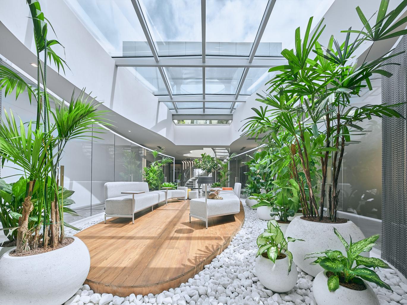 Following the same concept as the overall project, these two floors also feature a minimalist background created by using light gray tones in both matte and glossy surfaces, occasionally complemented by wooden surfaces. The goal is to achieve a sophisticated effect, similar to Management Floor. These floors are also characterized by an extensive landscaping project, where live plants are effectively incorporated into the interior space.