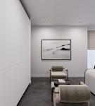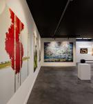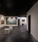 By choosing a limited color palette of black, white and gray and using vertical geometric lines, we created a minimal and calm space that allows the artwork to take center stage