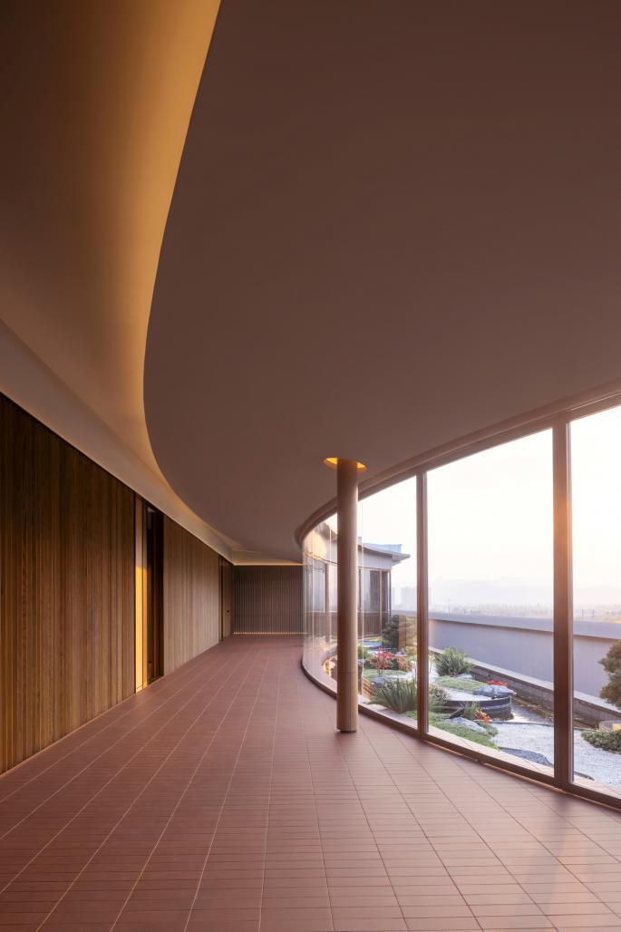 The semi-arc corridor is combined with the outdoor courtyard, which integrates the characteristics of indoor and outdoor spaces. The application of outdoor strip bricks on the ground and the opening and closing of multiple sets of pivot doors realise the free transformation between outside and inside, bringing an outdoor-like aerial courtyard experience. One side of the wall integrates entrance doors to six individual offices, with wooden lattice and doors made of the same colour material, creating the overall integri-ty of the space. The clean vertical lines bring delicate rhythm changes to elevation in the corridor.